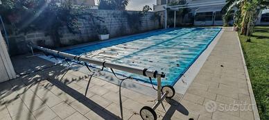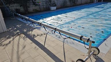 copertura isotermica a doppia bolla per piscina, dimensioni 13metri x 5 metri. Rullo telescopico in alluminio con ruote per facile avvolgimento e spostamento. usata 1 stagioni soltanto. Ottima: per il riscaldamento acqua, mantenimento temperatura piscina, copertura e protezione da foglie, sporco, ed animali. facile da avvolgere e svolgere.