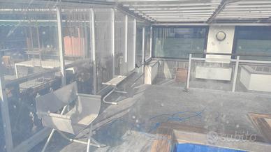 La struttura è apribile con guide e trasforma la piscina da coperta a scoperta.