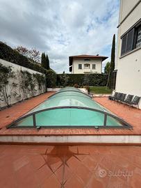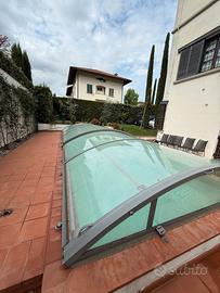 Modello: Bassa Scorrevole Cristal Composizione: 4 moduli fissi + 1 modulo X 430 + 2 moduli scorrevoli Dimensioni piscina: 9 x 4 mt Vendo copertura per piscina in ottimo stato, struttura colore antracite con pannelli in policarbonato cristal. Profilo basso, design elegante e discreto, perfetta per piscine interrate. Caratteristiche: -Apertura scorrevole -Pannelli in policarbonato trasparente -Struttura resistente agli agenti atmosferici -Protegge l'acqua da foglie, polvere e detriti -Mantiene la temperatura dell'acqua più a lungo -Completa di tutta la ferramenta e guide originali Smontaggio e trasporto: a carico dell'acquirente