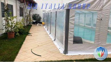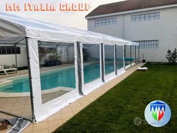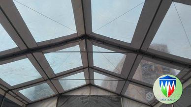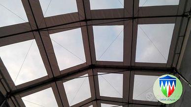 Potete scegliere 7 tipi di telaio in acciaio zincato Ø 38/50/78 mm. Dal Summer fino al Polar Plus, sceglire le altezze in gronda da 2,0 mt. fino a 4,0 mt. scegliere i teli tetto modulari, telo unico o Kristal /trasparente, in 3 tipi di grammature,inclusa Ignifuga 620 gr. Mq. per Uso Pubblico, vasta scelta di colori. Le pareti si possono avere in varie grammature inclusa Ignifuga 620 gr., varie colorazione, con inserti trasparenti panoramici, stile inglese, ciechi, oppure con gli obló uso magazzino, il tutto con chiusure Velcro System, per poter sigillare il tutto ed evitare spifferi di vento, le testate hanno il telaio di protezione contro venti forti, aperture molto piu´alte e scorrevoli, possibilita di avere aperture su telaio scorrevole o motorizzato..