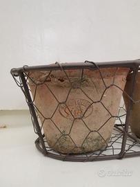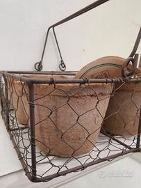 Cestino rettangolare in ferro con maglia a rete. 3 vasetti in cotto diametro cm 10 fatti a mano. Misura cm 36x13 h 8