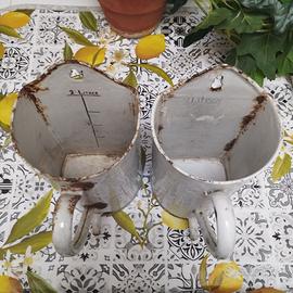Coppia di antichi irrigatori smaltati da parete di portata litri 2, epoca anni 30, si utilizzavano nei sanatori, dal fondo zampillava l’acqua e si installava un manicotto con un tubo con beccuccio che serviva per fare i clisteri.