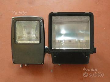 Fari per illuminazione esterna uso frequente per illuminare le facciate degli edifici o capannoni 150 watt ciascuno quello grande misura 26x30 altezza 40 cm. Funzionanti fino al momento dello smontaggio.