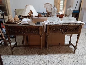 Bellissime e rare fioriere in legno con finitura oro. In buone condizioni generali. Il vano dedicato alle piante è rivestito di metallo zincato.
