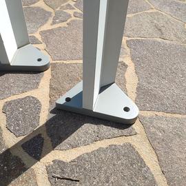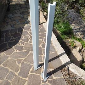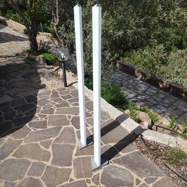 Vendo coppia di pali in alluminio anodizzato verniciato a polvere in colore grigio chiaro prodotto dalla ditta Goccia Illuminazione. I pali sono alti 155 cm e larghi complessivamente 14 cm. Sono predisposti per il passaggio dei cavi elettrici al loro interno e, nella parte superiore, sono dotati di un passaggio stagno per i cavi elettrici. Una robusta base di fissaggio a pavimento completa l’architettura costruttiva di questi oggetti di design per esterni.