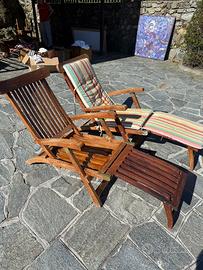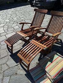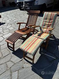 Set di due sedie a sdraio in teak da esterno. Ottima qualità, molto robuste e con inclinazione regolabile. Possibilità di richiuderle per facilitare trasporto. Disponibile un solo set di cuscini. Non spedisco. Disponibile per il ritiro nei dintorni di Ivrea (TO). Posso eventualmente valutare trasporto con mio furgone se nei dintorni.