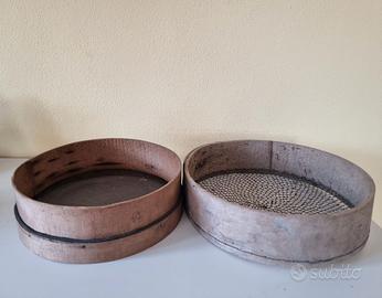 Coppia di setacci antichi circolari, realizzati in legno con fondo in rete metallica di diversa maglia. Strumenti tradizionali da uso domestico/agricolo (farine, cereali). Esemplari autentici, non restaurati.