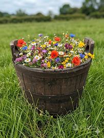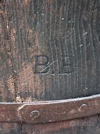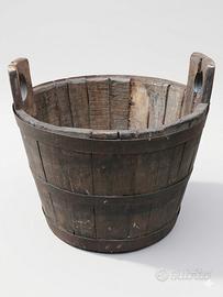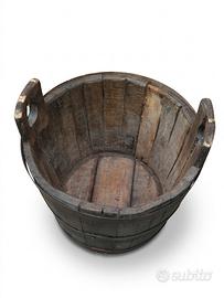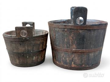 Coppia di tini per uva, d'epoca oggi ideali come fioriere. Lavati e puliti, pronti all'uso. Vendibili anche singolarmente, preferibile consegna a mano. Misure: - grande: altezza totale 52 cm (40 cm secchio) diametro 52,5 cm - medio: altezza totale 37 cm (29 cm secchio) diametro 42 cm