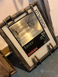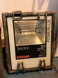 Vendo coppia di proiettori professionali Osram Powerlux, ideali per illuminazione esterna (giardini, piazzali, facciate) o per l'uso in cantiere. Si tratta di fari robusti di alta qualità "Made in Italy", molto resistenti agli agenti atmosferici. Caratteristiche Tecniche: • Modello: Osram Powerlux (Simmetrico/ Asimmetrico). • Potenza: 70W. • Compatibilità Lampadine: Supporta lampade a scarica ad alta efficienza tipo HQI-TS (alogenuri metallici) o NAV-TS (sodio alta pressione). • Grado di Protezione: |P66 (completamente protetto da polvere e forti getti d'acqua). • Alimentazione: 230V - 50Hz. • Condizioni: Entrambi funzionanti. • Un faro è completo di lampadina montata e pronto all'uso. • L'altro faro è privo di lampadina (facilmente reperibile online o in negozi specializzati). • Stato estetico: Presentano normali segni di usura dovuti all'utilizzo esterno, ma le scocche e i vetri sono integri.