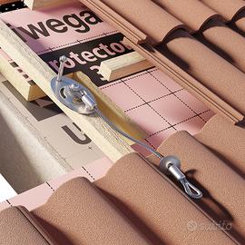 Dispositivi certificati secondo le normative EN di riferimento, come da scheda tecnica Riwega, idonei per lavori in quota e sistemi anticaduta su coperture.