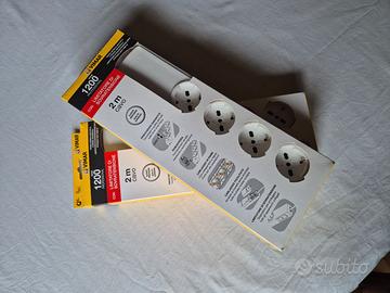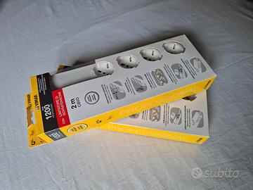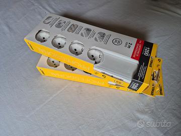 Coppia multiprese Vimar 01296.SPD.CC.B con limitatore di sovratensione integrato (sostituibile) con spia led. Serie professionale con cablaggio in rame, tecnopolimero autoestinguente, cavo di 2 metri con presa italiana 16°, 4 prese schuko e bipasso 10 / 16 a, inclinati a 45 gradi per massima utilizzabilità contemporanea, protezione bimbi inclusa, carico massimo contemporaneo certificato 3680 watt, possibilià di fissaggio a muro con tasselli o fascette. Inutilizzate, vendo in coppia.