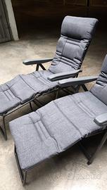 Coppia poltrone reclinabili con poggiapiedi. Altezza schienale 105cm, larghezza 50cm, profondità 60cm/110cm. Regalo, se interessati, coppia di sedie tipo regista.
