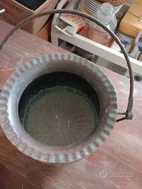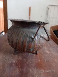 vendo due vecchi portavaso in rame con manico e tre piedini , diametro esterno cm 16, foro interno diametro 12 cm , altezza totale centimetri 14 , piedini cm2 circa