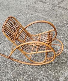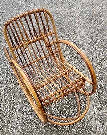 Vendo splendida coppia di sedie a dondolo vintage in bambù e rattan intrecciato: una misura grande per adulto e una misura piccola per bambino. Solide, comode e con design elegante e senza tempo. La sedia grande è completa di cuscino floreale originale.