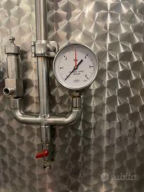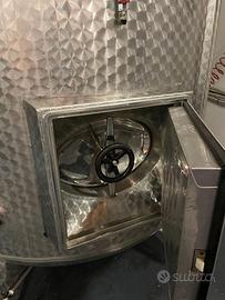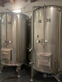 Serbatoio enologico capacita 30HL in acciaio inox per stoccaggio vino dotato di una portella d'ispezione ovale, rivestimento fiorettato, fascia di raffreddamento a circuito forzato, valvole a garolla a 40 mm, tubo di rimontaggio, apertura superiore con valvola a garolla da 120 mm,livello, assaggiavino, valvola di sicurezza, manometro e termometro, attacco per sonda automatica, attacco interno per candela porosa, valvola immissione Co2 e poggiascala.