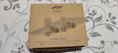 coppia valvole e detentore a squadra 1/2 24/19 bianche con raccordi multistrato da 16 per termoarredo da bagno. + valvola testa termostatica....tutto assolutamente nuovo. Mai usato in quanto comprato in eccesso.