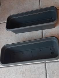 coppia di piccoli vasi grigi con sottovaso, ideale per interno o da davanzale, per la coltivazione di erbe aromatiche o fiori. dimensioni cm32x12, e 9cm di profondità