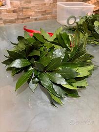 Corona di alloro naturale per laurea. Può essere decorata con nastri rossi o di un altro colore, su richiesta si possono aggiungere altri decori (peperoncini, bacche, fiori...)