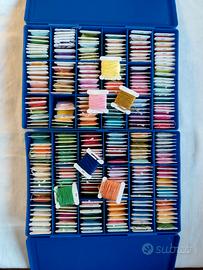 2 scatole blu Kit punto croce Colours Collection contenenti in tutto 296 bobine di cotone di vari colori. 14 matassine di cotone mouliné