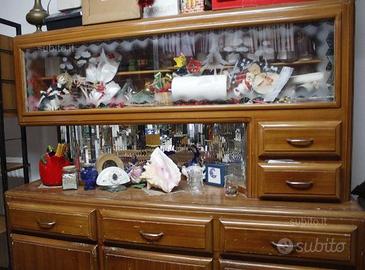 credenza ( alta cm. 172, larga cm. 153 profonda cm. 46) con tre cassetti, tre porte, mobiletto (alto cm. 80, largo cm. 77 profondo cm. 45), tavolo (alto cm. 80, profondo cm. 80, largo cm. 150) tutto in legno massiccio.