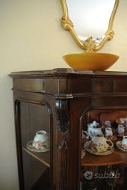 Credenza fine ottocento con due ante e un ripiano interno, vetri sulle ante e sui laterali,(due vetri laterali rotti)fronte mosso,intagli con elementi fogliacei. Misure: Altezza:cm 100 Larghezza:120 cm Profondità:cm 50