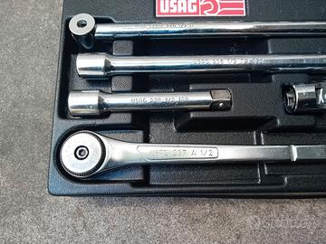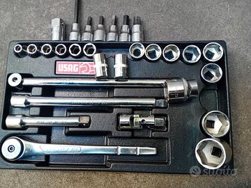 Set cricco da 1/2 composto da vasca in plastica con cricchetto, prolunghe, bussole, snodo, leva a T, e ulteriori bussole esagonali a brugola usato poco tutto di marca usag, vendo in blocco a 80 euro non trattabili possibilità di spedizione a parte