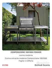 Cucina da esterno di design dell’azienda Fogher con doppia possibilità di cottura: piastra in acciaio e ampia griglia in acciaio. Lunghezza 220 cm + un modulo indipendente di 45 cm pensato come vano bombola del gas. Profondità 70 cm e altezza del piano cottura 112 cm compresa la copertura. Foto effettuate prima dello smontaggio e dell imballaggio. Prezzo trattabile