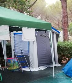 Vendo cucinotto Denver Conver da campeggio grigio e azzurro 200×150×215 cm In ottime condizioni solo in due punti i pali sono leggermente piegati a causa di alcune ventate subite in campeggio ma non è assolutamente un problema per il montaggio.