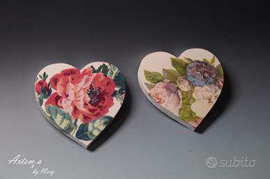 Cuore in legno 11x11cm spessore 1,3cm decorato su una facciata con tecnica Decoupage fatto a mano personalmente. con gancio apprendimento sul retro.