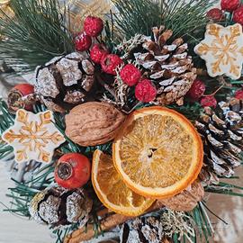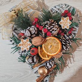 Cuore da appendere in vimini con decorazione natalizia/invernale realizzata con elementi naturali.