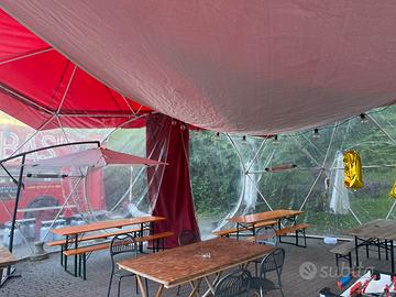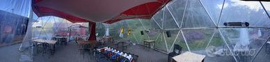 Cupola geodetica diametro metri 10, altezza 5 , usata. Struttura portante tubolare in acciaio zincato con rivestimento plastico bianco, due ingressi, apertura a zip, altissima resistenza neve, pioggia, ottima resistenza vento. Coperura trasparente con inserti rossi. Disponibile con immpianto riscaldamento soffione e lampade riscaldanti.