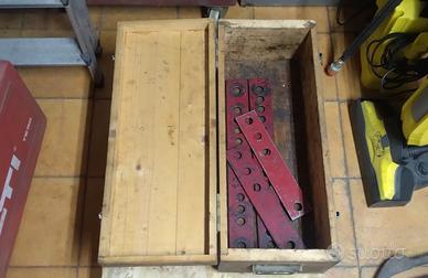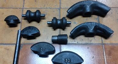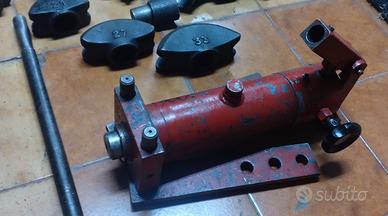 n vendita curvatubi idraulica (o "curvatubi a pistone") È uno strumento indispensabile per chi lavora con l'idraulica, l'impiantistica o la carpenteria metallica. A differenza di una semplice piegatubi manuale, questa utilizza la forza di un martinetto idraulico per piegare tubi di metallo anche di grosso spessore senza schiacciarli. Il set si compone di : 1) Il Pistone Idraulico (corpo rosso): È il cuore del macchinario. Azionando la leva, il pistone spinge in avanti con una forza di diverse tonnellate. 2) Le Matrici (i pezzi neri a mezzaluna): diametro 17, 21, 27, 33 , + 2 più grandi 3) I Rulli di contrasto: Sono quei due pezzi cilindrici con i perni. Vanno inseriti nei fori della piastra di base per tenere fermo il tubo mentre il pistone spinge al centro. 4) La Leva: L'asta lunga di metallo che serve per pompare l'olio e far uscire il pistone. 5) Scatola di legno : per riporre l'utensile. La vernice è leggermente deteriorata , ma è un fattore puramente estetico , il pistone funziona alla perfezione.