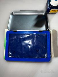 Cuscinetto per timbri e timbro Lebez.Colore Blu.Come nuovo!!!con ricarica inchiostro quasi piena.