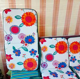 Tre cuscini per sedie da giardino,praticamente nuovi,perfetti per qualsiasi tipo di sedia e seduta(in legno, alluminio o le comuni sedie in plastica).Fantasia floreale su base avorio,cordini laterali per fissaggio alle seduta,lavati e sanificati.Prezzo trattabile.