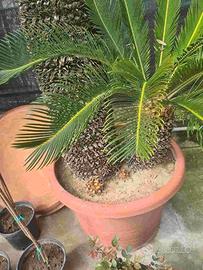 La pianta nell'immagine è una Cycas revoluta. È una pianta ornamentale molto antica, spesso chiamata "palma nana" per il suo aspetto, sebbene non sia una vera palma. Presenta un troncolungo e robusto sormontato da un ciuffo di foglie pennate di un verde intenso e lucente. Cresce molto lentamente e fiorisce raramente, a volte ogni 15 anni. È una pianta rustica che predilige posizioni soleggiate e resiste a temperature miti,
