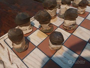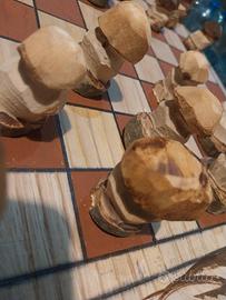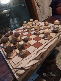 Le pedine rappresentano il fungo porcino, la scacchiere e decorata con intagli che, rendono il pezzo unico e perfetto, sia per giocare che come oggetto d' a arredo o pezzo unico da collezione.