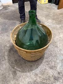Vendo splendida damigiana in vetro verde soffiato con cestello originale in legno, ideale sia per enologia che per arredamento vintage, giardino, collezionismo o come oggetto decorativo di grande effetto.