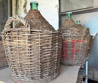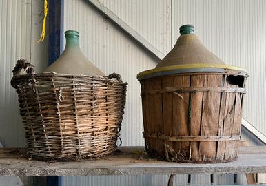 Damigiane da 54 litri in vetro verde. Ideali per arredo giardino o casa. Da ripulire o restaurare. 6 PZ foderate in legno 8 PZ foderate in plastica 20 euro l’una