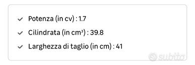 Decespugliatore a scoppio 2 tempi 39.8 cm in alluminio AL-KO GT 410, in ottime condizioni generali. Peso circa 10 kg. Compreso fornisco olio motore, olio miscela e borraccia graduata per la relativa preparazione. Necessita messa a punto poiché ferma da oltre un anno. Date le dimensioni, non propongo la spedizione a mia cura ma posso consegnare l'oggetto a vostro incaricato