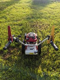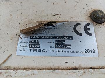 Decespugliatore a ruote TR 60 TEKNA con larghezza di lavoro di 60 cm, equipaggiato con un potente motore a benzina 4T e un cambio a 3 velocità.