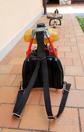 Decespugliatore a zaino KAAZ VRX360; motore 2 tempi Mitsubishi T180; cilindrata 32,5 cc; potenza 1,7-1,8 CV; peso 10,2 kg Completo di manuali di istruzioni originali.