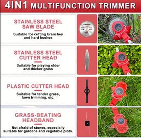 - **Vari Tipi di Lame:** Include quattro tipi di lame ad alta efficienza: lame in plastica e corde da taglio per erba tenera; lame ad angolo retto per erbacce e piccoli arbusti; lame per seghe circolari per potare piante più spesse.