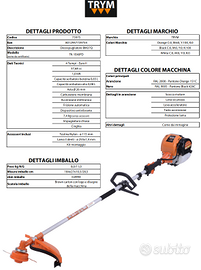 Cilindrata: 37,68 cc, tipo di motore: 4 tempi euro ii, impugnatura: chiusa, ø asta: 26 mm, peso 7,4 kg. Capacita serbatoio benzina 0,65 lt e capacita serbatoio olio 0,08 lt, testina nylon ø 115 mm, lama a 3 denti ø 225x1,4 mm con kit di montaggio.