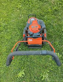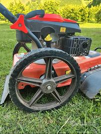 Testa a filo montata su ruote con larghezza di lavoro di circa 55 cm, altezza di taglio regolabile, manico regolabile/pieghevole, avviamento a strappo.