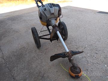 Comodissimo, montato su carrello, agile, leggero, permette lavoro facile senza vibrazioni a carico. Motore potente e serbatoio grande. Alimentazione a miscela. Usato per rifiniture intorno alle piante, perchè facilmente estensibile nonostante chiome basse, che impedirebbero un decespugliatore normale. Lunghezza asta regolabile intorno ai 30 cm., idem altezza manubrio.