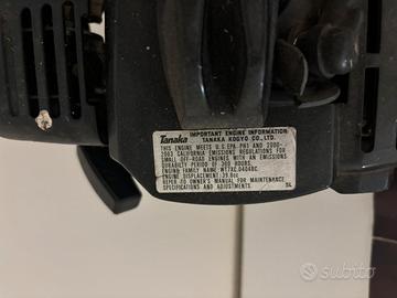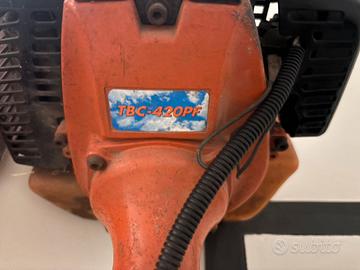 vendo decespugliatore Tanaka modello TBC-420PF con motore a scoppio da 39.8 cc. macchina robusta e potente, ideale per taglio erba, rovi e lavori di giardinaggio anche impegnativi. usato ma funzionante con normali segni di utilizzo. motore Tanaka affidabile, completo di asta e impugnatura. motore 2 tempi, cilindrata 39.8 cc , mpugnatura ergonomica con parasassi incluso