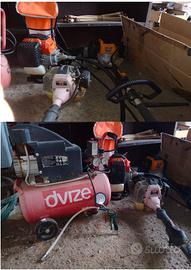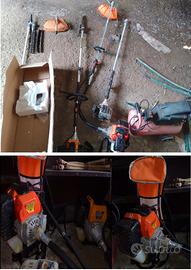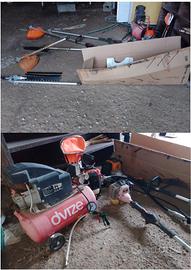 Solamente tutto quanto in stock a 250 € poco trattab. N. 3 decespugliatori: 1 a zaino professionale 50 cc, si può smontare in due pezzi, con prolungamento flessibile, leggero comodo con schienale e imbragatura, facile utilizzo. tenuto benissimo, utilizzato per un piccolo terreno a fine anno ma ora non si avvia, lasciato perfettamente funzionante a dicembre scorso, solo da pulire. Condizioni ottime. Idem il decespugliatore professionale multitool multifunzione 43 cc utilizzato con la motosega per tagliare rami una settimana fa a metà marzo, perfettamente funzionante ma ora accende solo insistendo, mentre altre volte non ci riesco, non conosco il motivo, usato poco, acquistato nuovo tre anni fa, scatola originale disponibile, utilizzato solo come decespugliatore e a volte la motosega potatura come giorni fa funzionando benissimo, la catena è poco usata, la lama tagliasiepi è nuova mai usata mai montata, condizioni ottime, specifiche tecniche in foto, è incluso anche l’originale libretto manuale d’uso. Entrambi recenti acquistati negli scorsi anni. Incluse tutte le applicazioni in foto: motosega decespugliatore e lama tagliasiepi nuova, più qualche ricambio. Più altro decespugliatore, quello rosso leggero che in foto è tra i due arancioni, è stato fermato anni fa ed è da revisionare, lasciato funzionante comunque. Incluso nel prezzo il compressore carrellato 25 lt, poco adoperato e perfettamente funzionante, compresa pistola con manometro seminuova, posso attaccarlo alla corrente e insieme constatare il perfetto funzionamento. Prezzo per l’intero blocco 250 €, non cedo singole attrezzature. Prima di scrivermi che è troppo, sappiate che non è neppure il prezzo del solo decespugliatore a zaino, quest’ultimo e quello multifunzionale vanno solo ripuliti, probabilmente basta spruzzare uno specifico prodotto nel carburatore per riavviarsi entrambi, il secondo con la lama motosega ancora montata l’ho letteralmente utilizzato poco più di una settimana fa per tagliare dei rami.