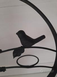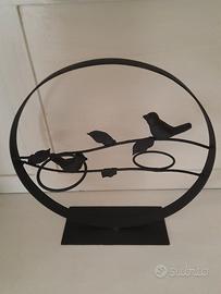 Decorazione per la casa in ferro colore nero, rappresentante uccelli su ramo con foglie,con 2 appoggi per esporre piantine, misure diametro 28 cm.