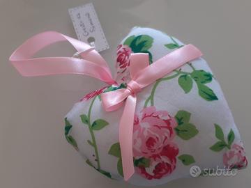 Il tessuto è in puro cotone fondo bianco con rose rosa, imbottito in fibra sintetica e decorato con fiocchetto in raso rosa.