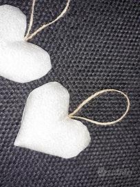 Set di 3 cuoricini i tessuto colore argento da appendere all'albero di Natale o da utilizzare come decorazione natalizia o per personalizzare un pacchetto regalo.
